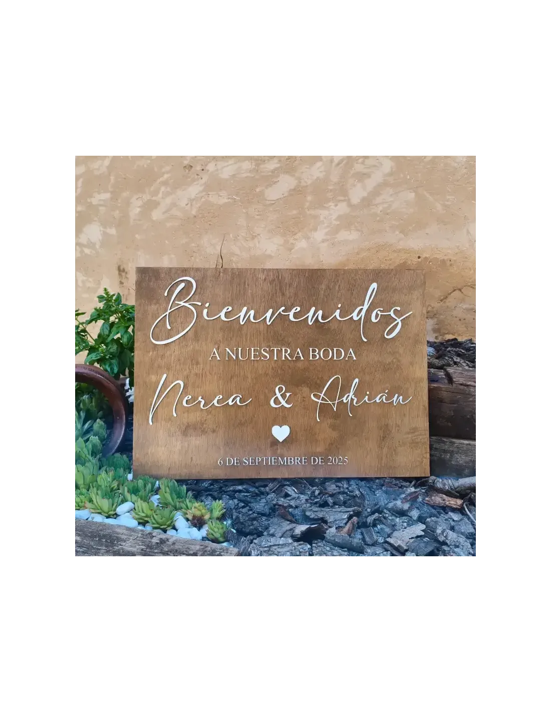 Disponible en dos preciosos acabados: haya natural o blanco, y con letras en relieve que aportan un toque único. Puedes elegir el color de las letras entre blanco, negro o dorado, para que combine perfectamente con la decoración del evento.