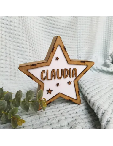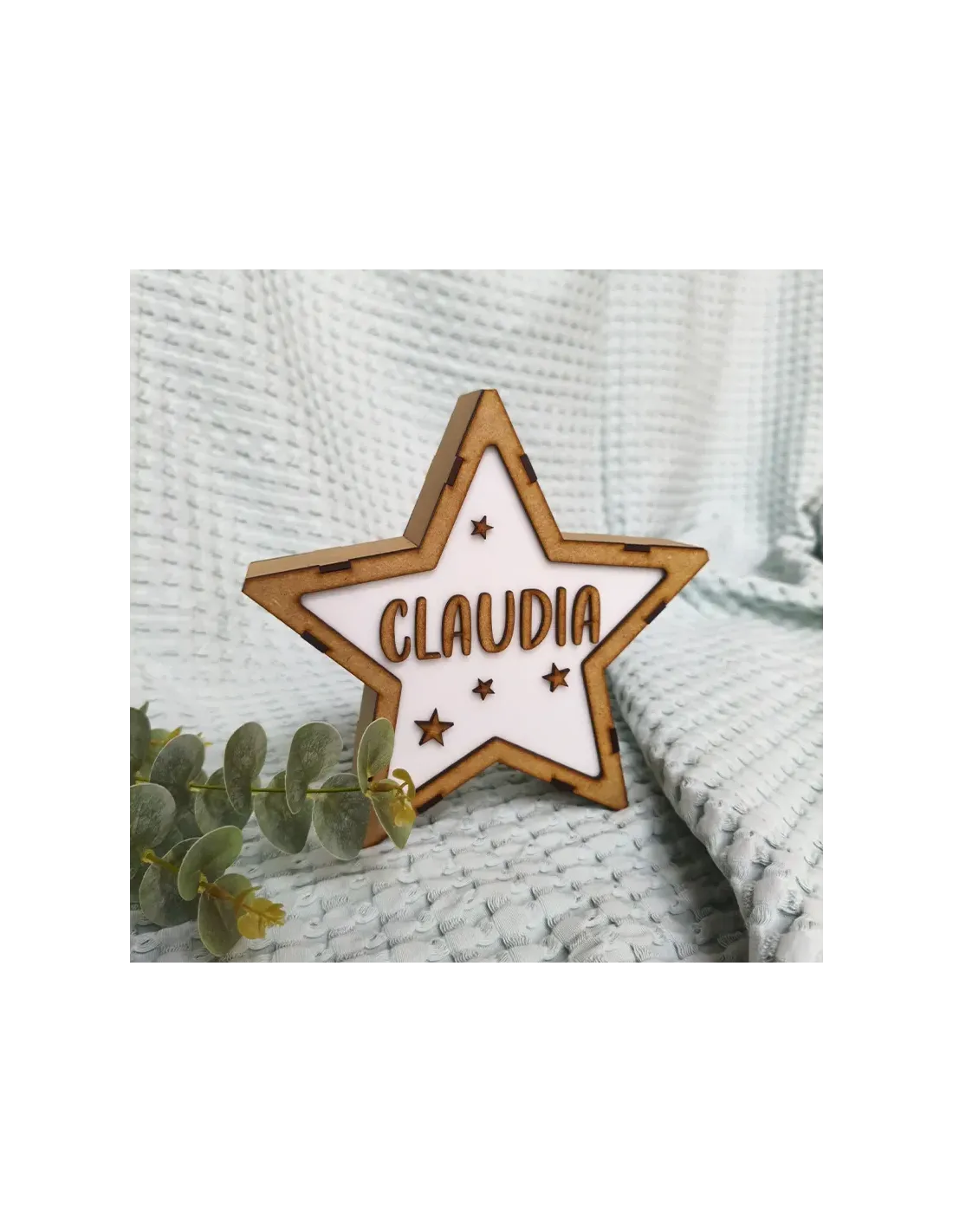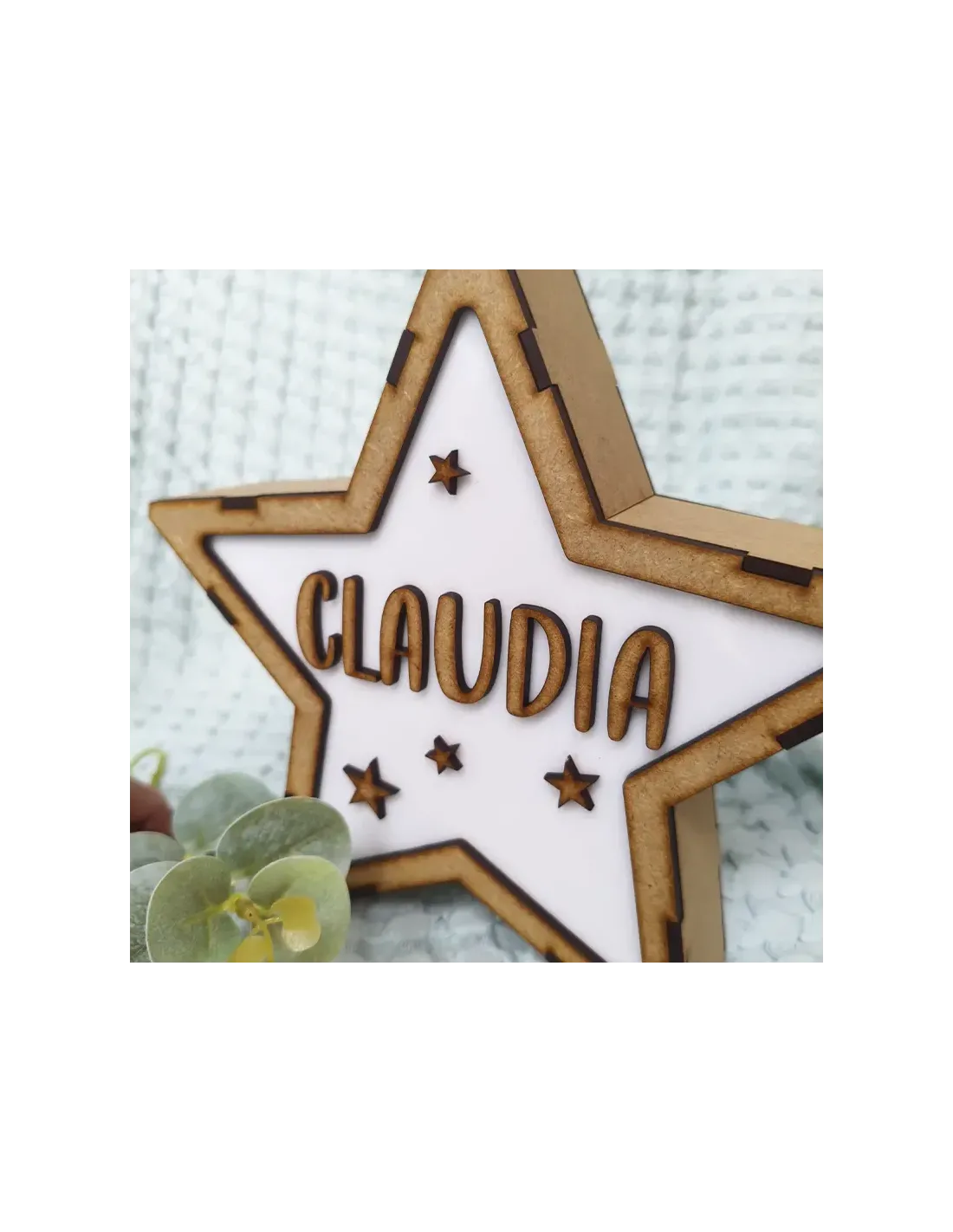 Hecha en madera, con luz interior, esta estrella se personaliza con el nombre que elijas, convirtiéndola en un regalo inolvidable para los más pequeños de la casa.