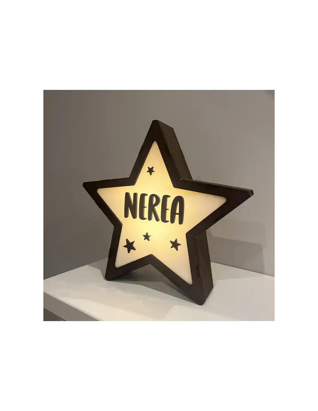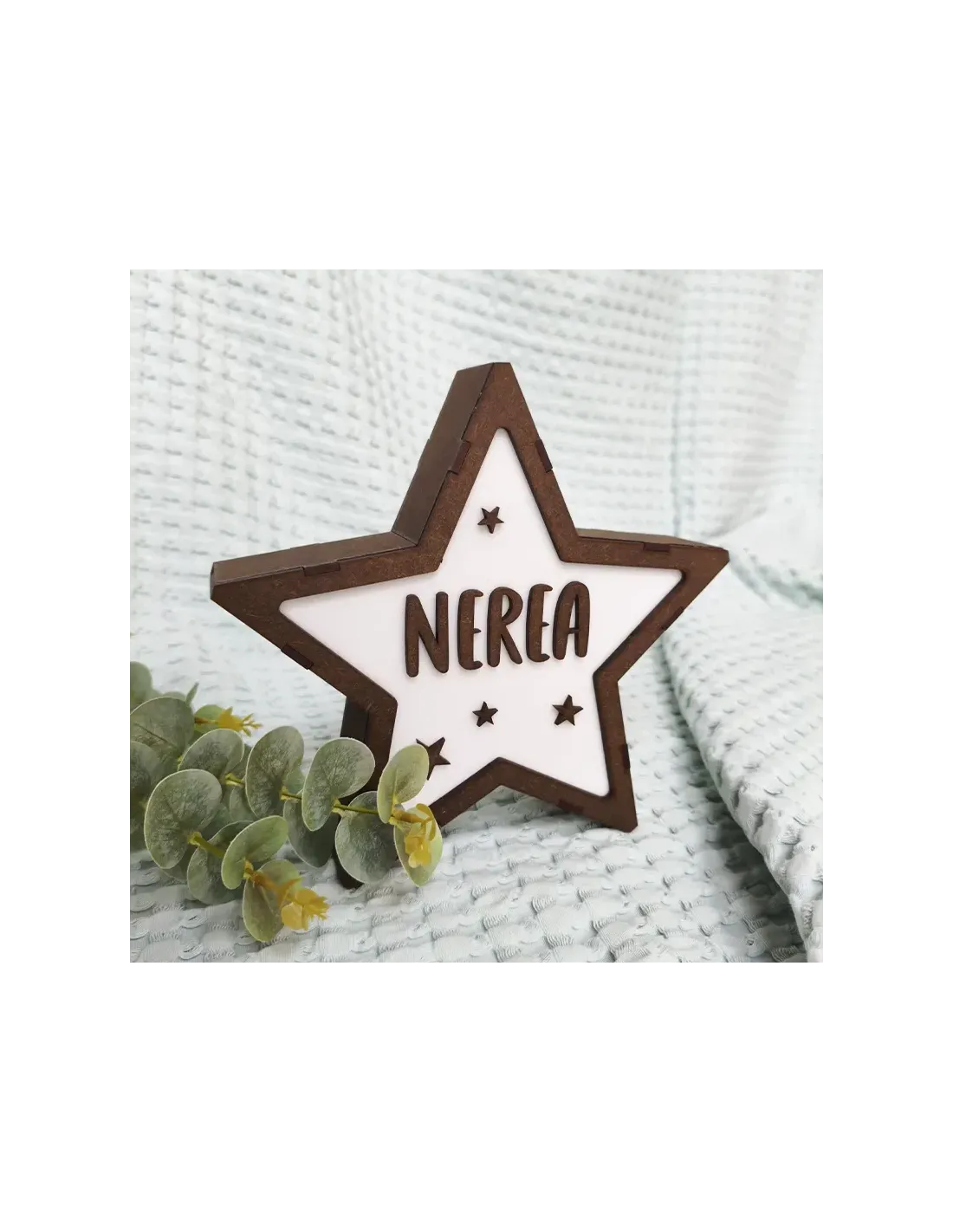 Hecha en madera, con luz interior, esta estrella se personaliza con el nombre que elijas, convirtiéndola en un regalo inolvidable para los más pequeños de la casa.