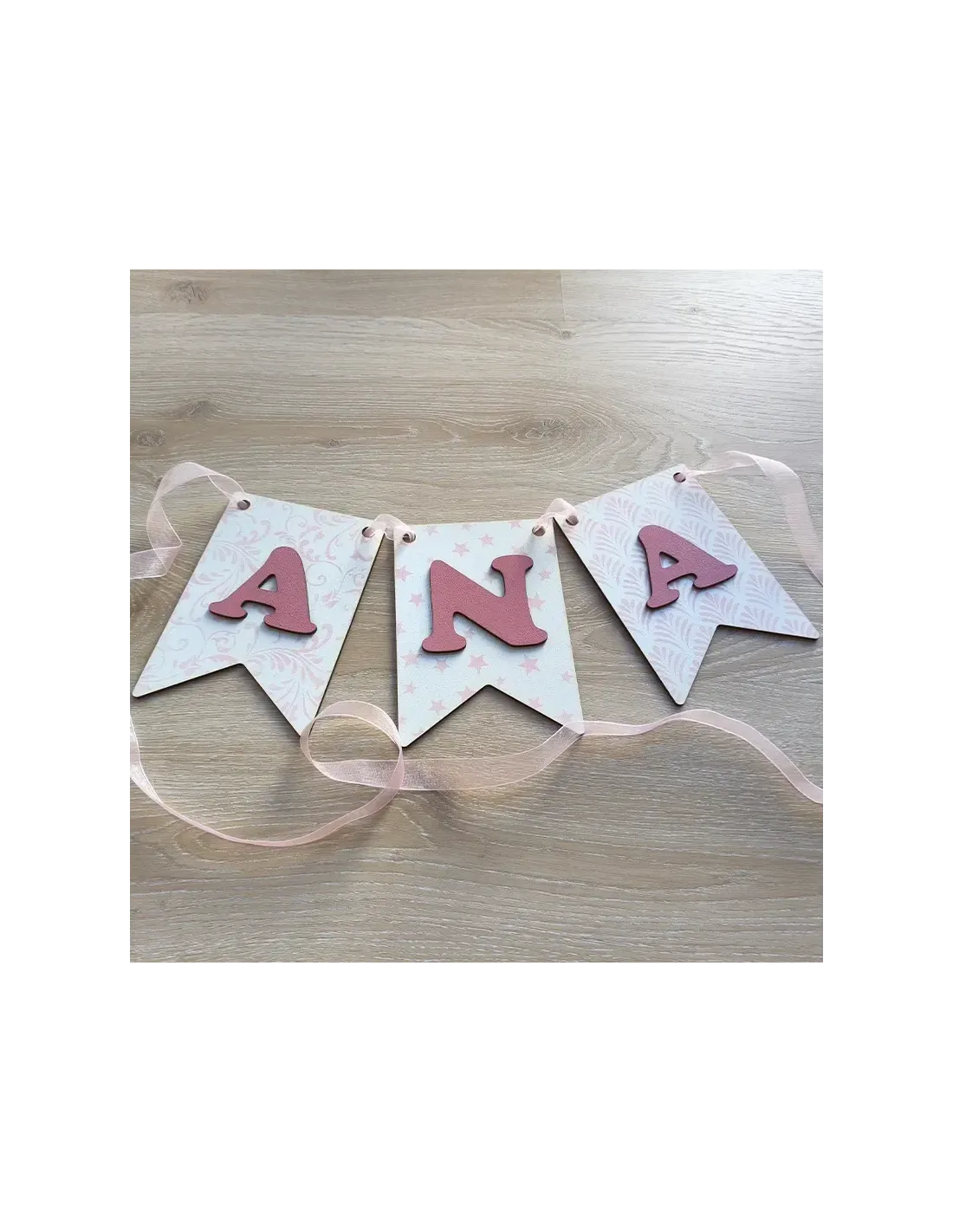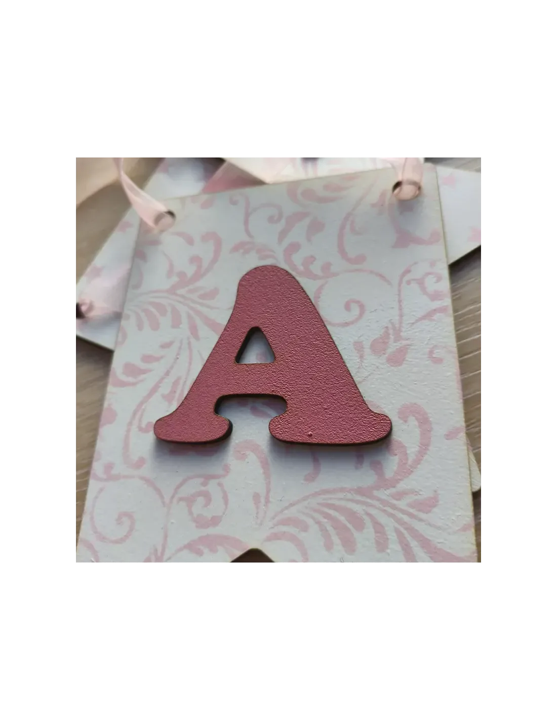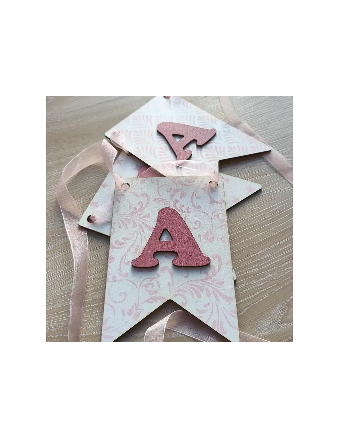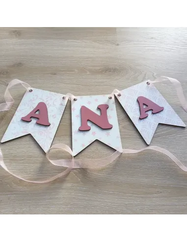 • Banderín en madera DM de 5mm grosor con acabado en blanco y rosa/azul de 18.6 x 13 cm con inicial en madera DM con acabado rosa/azul de 3mm de grosor.