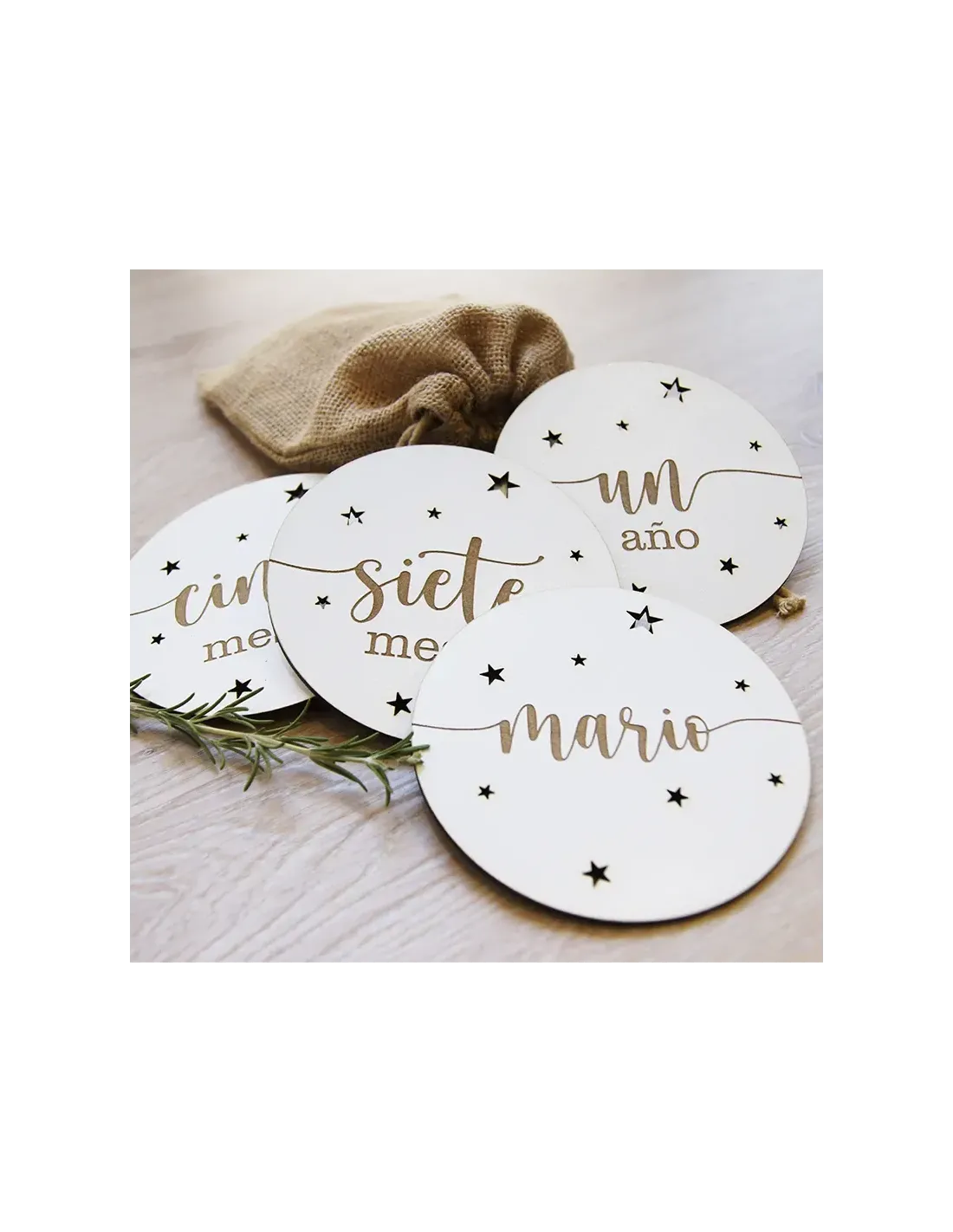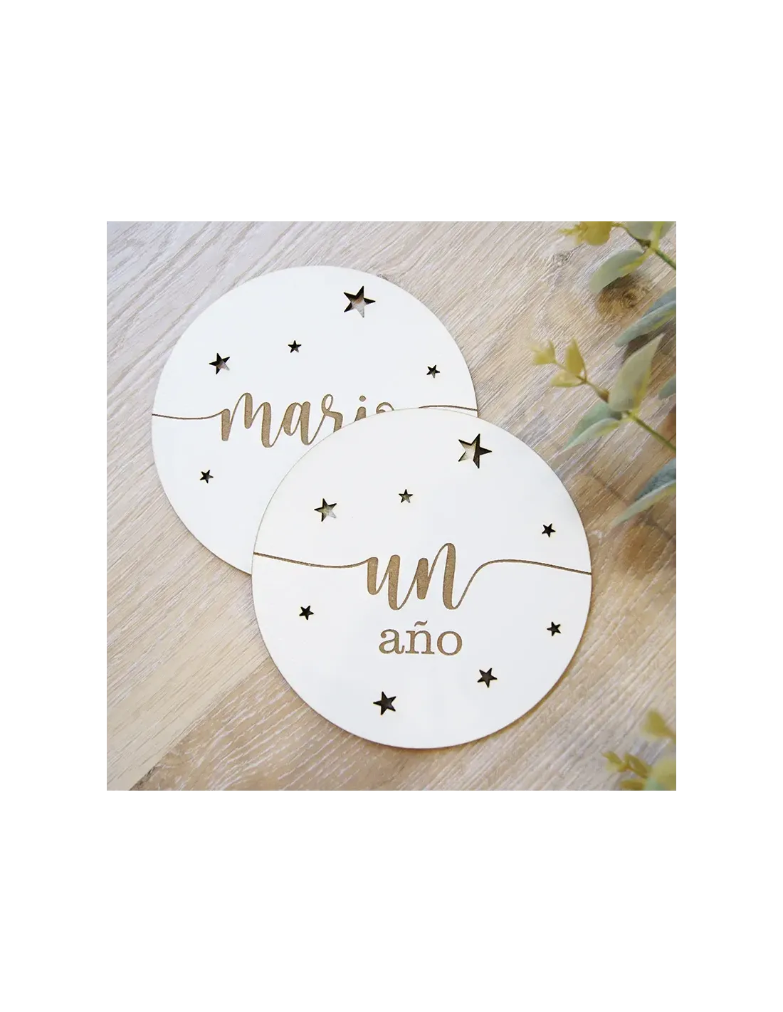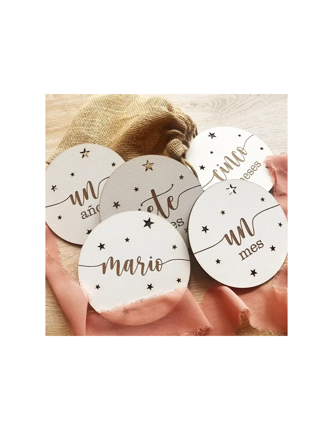 Nuestros sets de placas, con acabado blanco, son el detalle perfecto para acompañar el primer añito de tu bebé mes a mes. Personalizados con su nombre y decorados con estrellitas, son ideales para capturar cada etapa de su crecimiento con mucho estilo y dulzura.