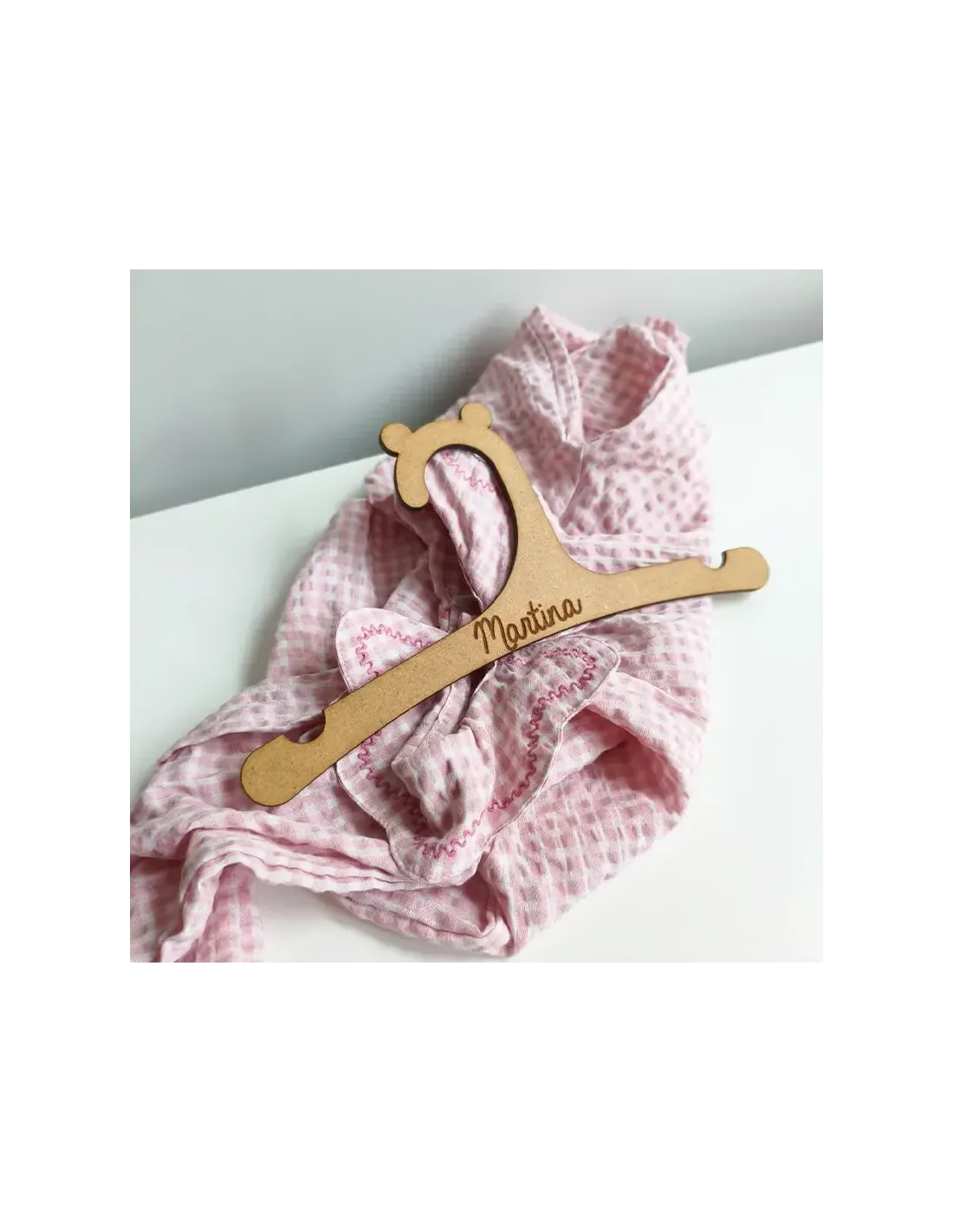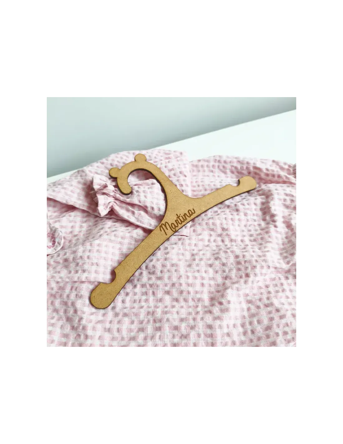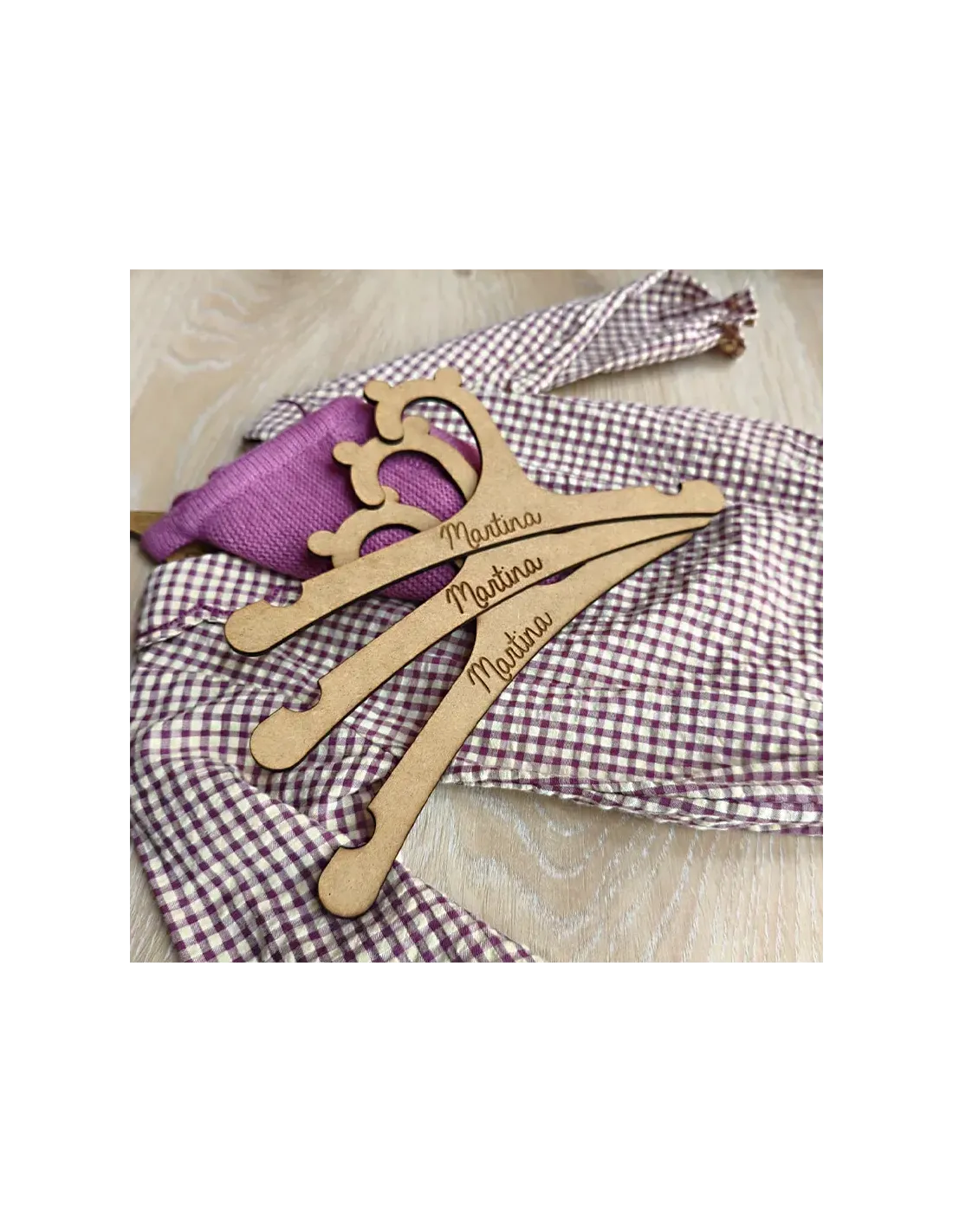 Está elaborada en madera natural y grabada con el nombre del bebé, cuidando cada detalle para lograr un acabado suave y armonioso. Su tamaño y forma están adaptados a la ropa infantil, ayudando a conservar las prendas en perfecto estado.