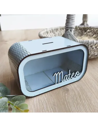 Disponibles en tres colores suaves y encantadores —rosita, azulito y verde agua—, cada hucha se personaliza con el nombre del niño o niña.