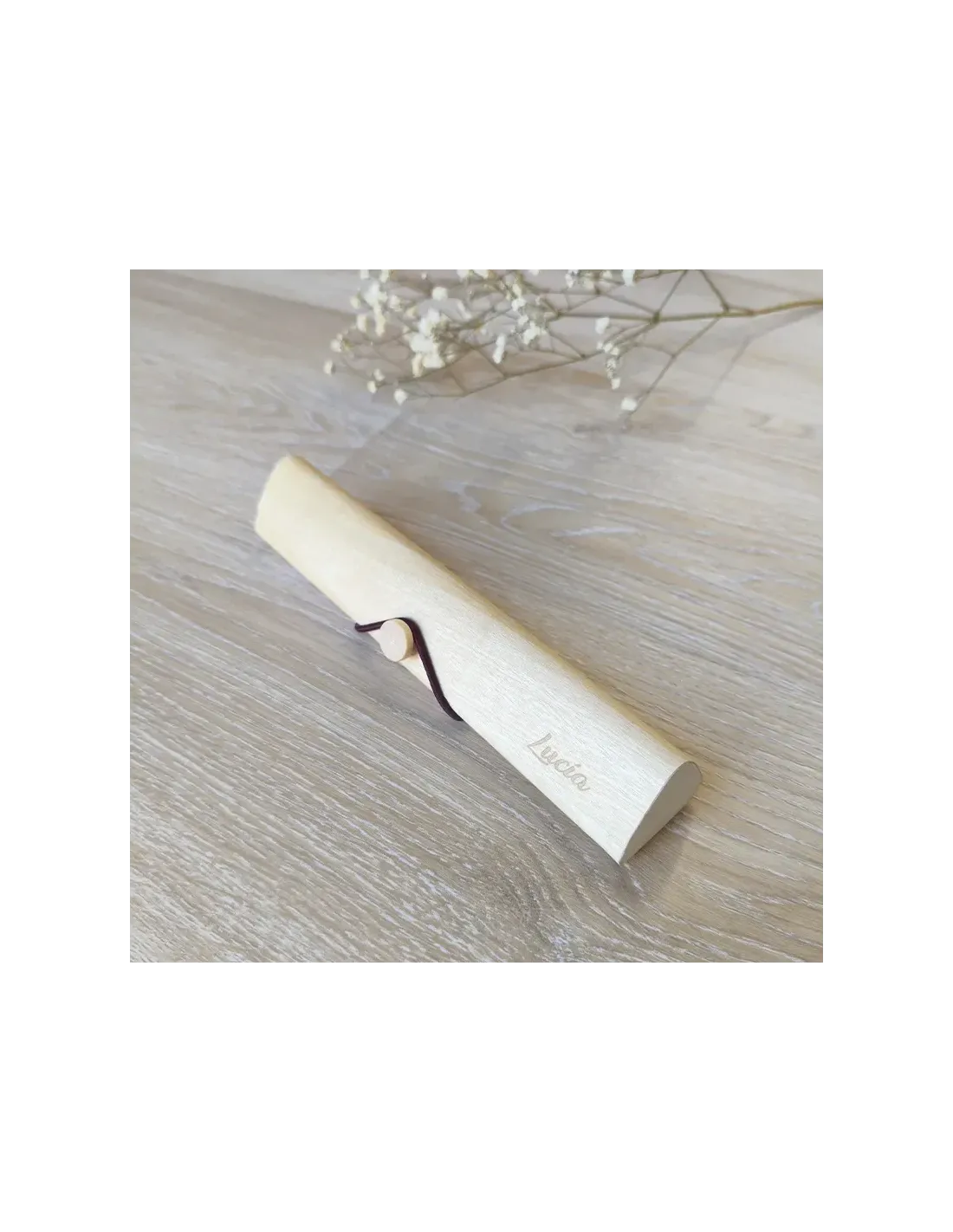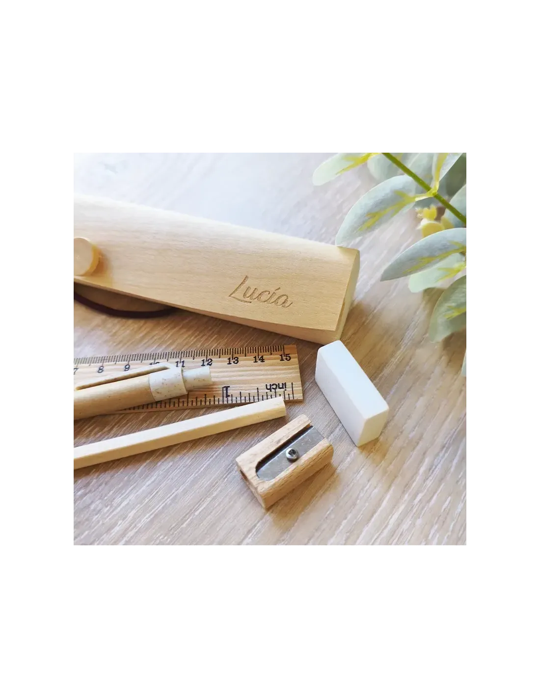 No olvide guardar su personalización para poder añadirla al carrito- Estuche personalizado fabricado en madera con cinta elástica de cierre y cinco accesorios incluidos: bolígrafo de mecanismo pulsador en cartón reciclado y tinta azul, lápiz de madera de 17 cm, regla de madera de 15 cm, sacapuntas de madera y goma blanca.