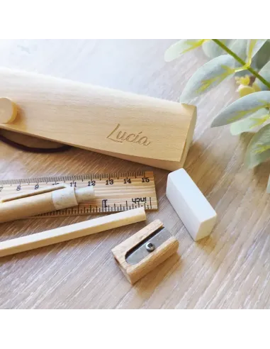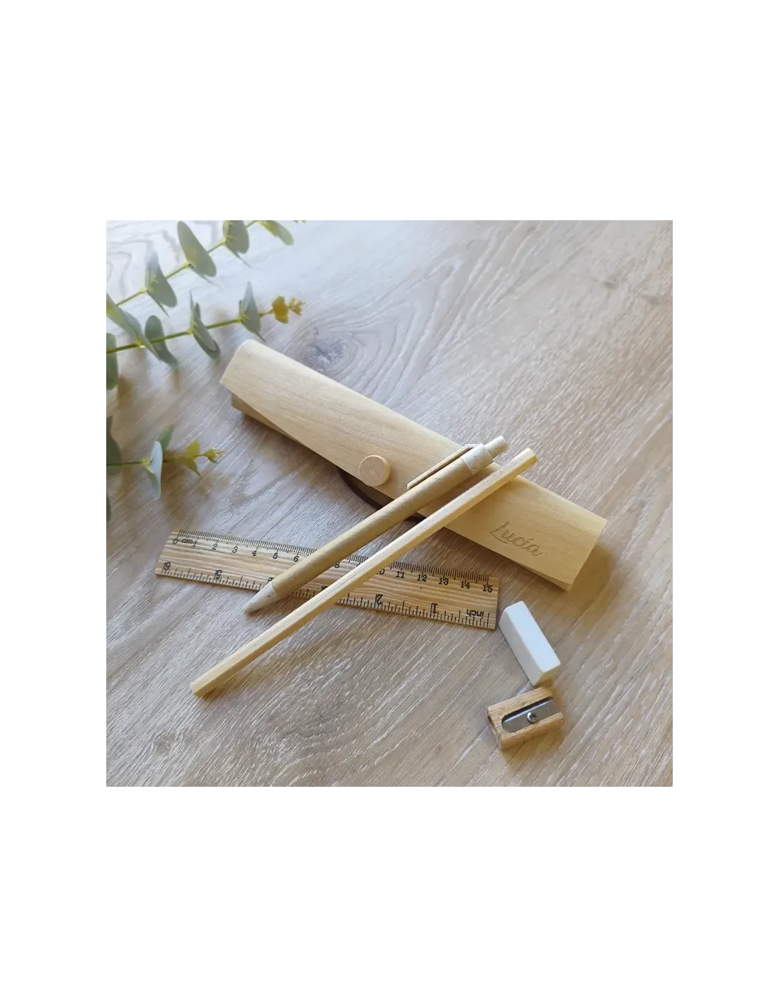 Incluye un estuche de madera grabado con nombre personalizado, un bolígrafo, un lápiz, una regla, una goma de borrar y un sacapuntas, todo en tonos suaves y naturales que evocan serenidad y armonía. Cada elemento ha sido cuidadosamente seleccionado para ofrecer una experiencia de escritura práctica, sostenible y con mucho estilo.